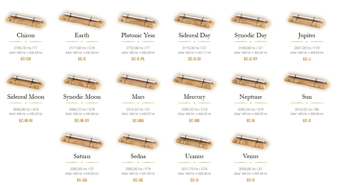 Les nouveaux MEINL ENRGY CHIMES sont réalisées en utilisant les calculs de Hans Cousto (L'Octave Cosmique) pour correspondre aux fréquences du soleil, de la lune et des planètes. Chacun est accordé pour produire la fréquence correspondante du corps céleste. Ces chimes ont été conçus pour une utilisation dans des applications thérapeutiquesQuantité: 1