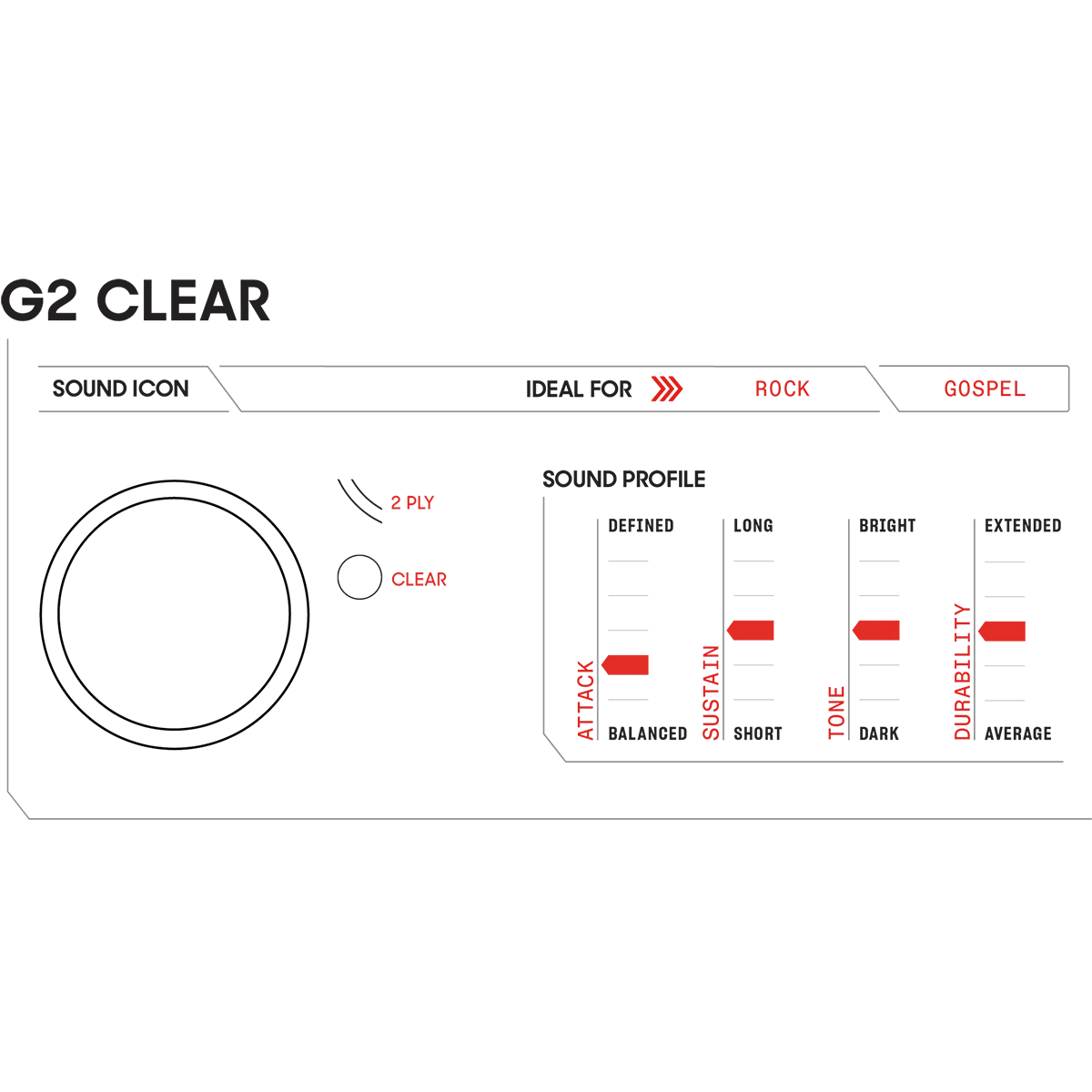 - Peaux polyvalentes, avec une attaque équilibrée, un sustain moyen, une sonorité légèrement brillante et une durabilité moyenne.
