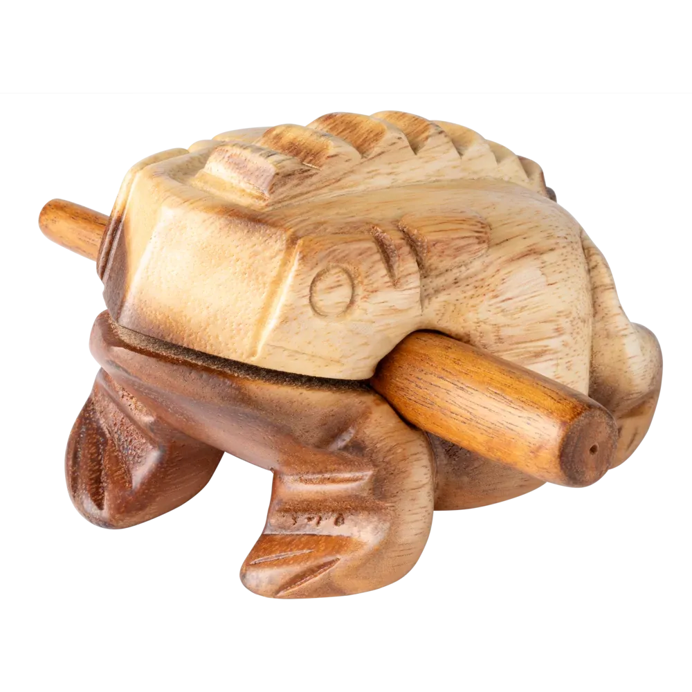 La Grenouille Güiro NINO® Percussion est creuse à l'intérieur avec un dos strié qui crée un son "ribbit" lorsque vous faites glisser la baguette dessus. L'aspect de l'instrument le rend amusant à jouer pour les enfants. Il produit un son chaud et doux qui s'harmonise avec d'autres instruments dans une salle de classe. Les enfants peuvent également en jouer à la maison. Comprend un grattoir en bois.