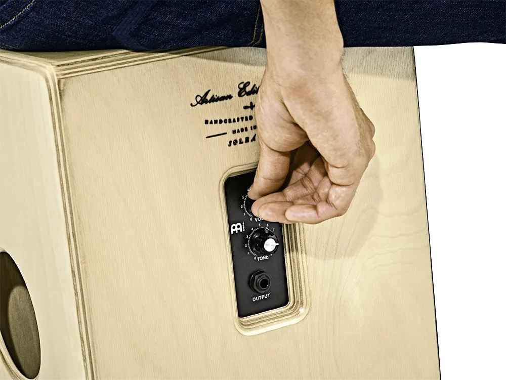 Lorsqu'une amplification est nécessaire, à l'intérieur du Cajon se trouve un micro piézo avec contrôle de la tonalité et du volume à l'extérieur.