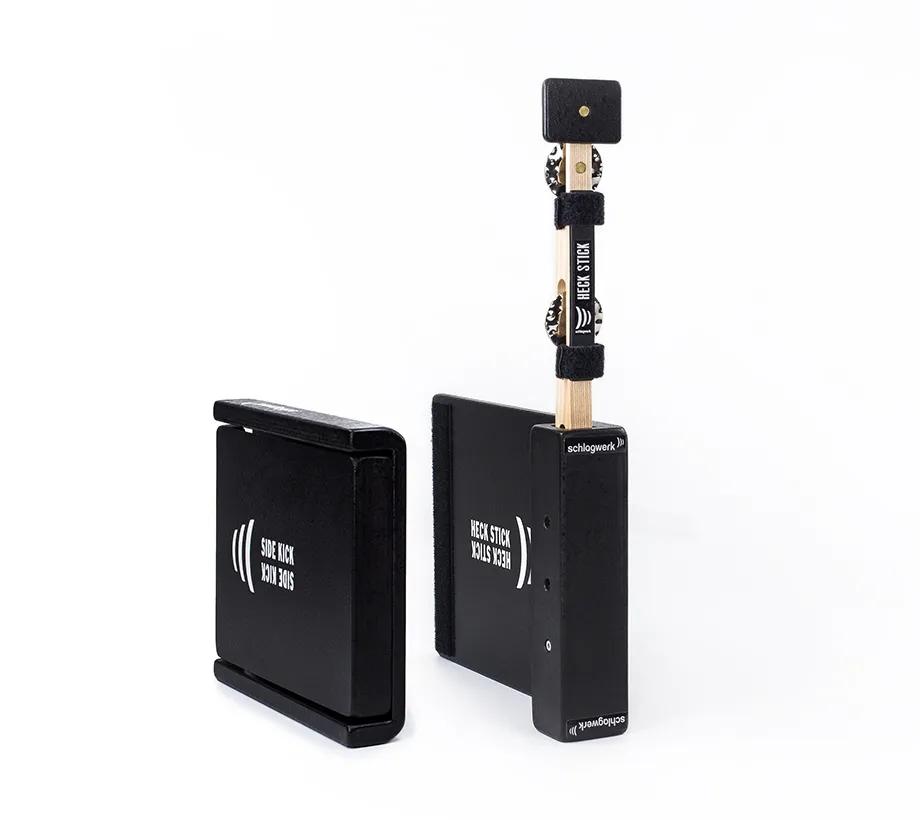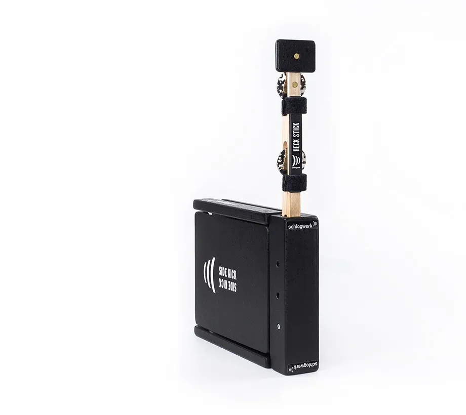 La possibilité de combiner le Heck Stick et le Side Kick en un set semble particulièrement judicieuse. En effet, le Side Kick est exactement adapté à la plaque de fixation du Heck Stick. En fonction de la technique de jeu, les deux parties du set peuvent être utilisées ensemble ou séparément sur les deux côtés du cajon. Les nombreuses possibilités de combinaisons qui en résultent permettent à chacun de jouer sur un set personnalisé.